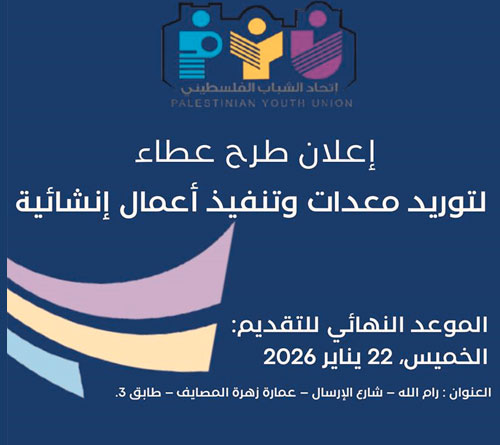 Submission deadline: Thursday, 22 January 2026, at the Palestinian Youth Union premises (submission in a sealed, signed, and stamped envelope)